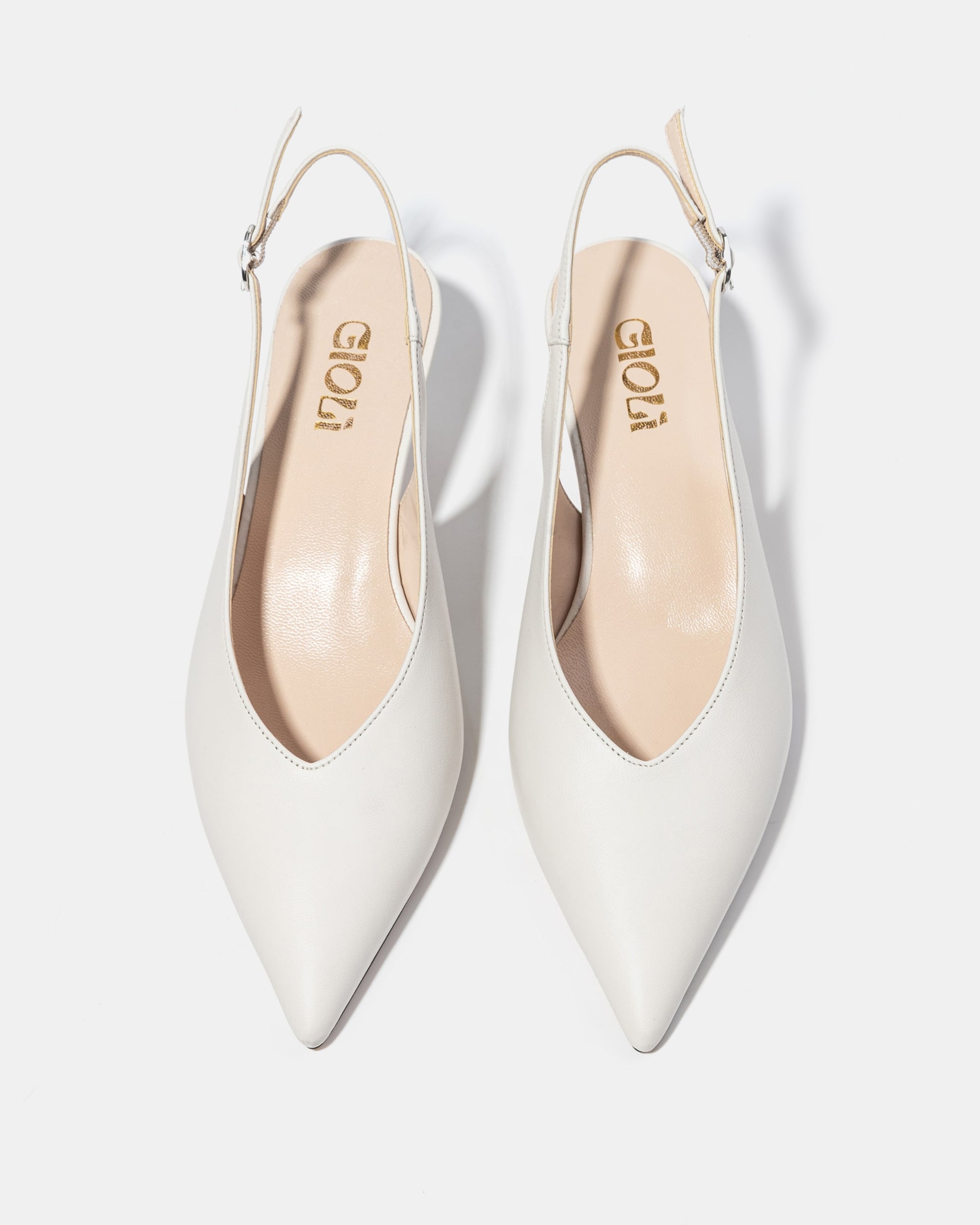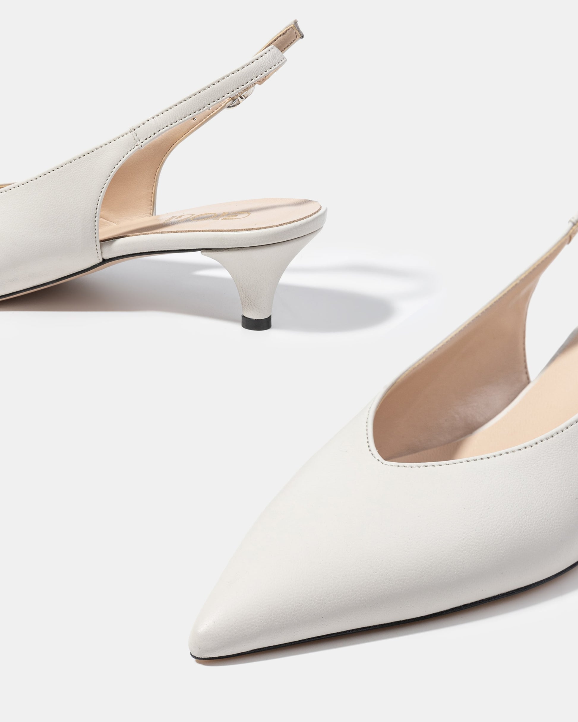 This slingback exudes a serene elegance with its clean lines and refined profile. Crafted from smooth, supple leather, its pointed toe and delicate kitten heel contribute to a graceful silhouette. The adjustable strap around the ankle ensures a secure, personalized fit while adding a touch of timeless sophistication.